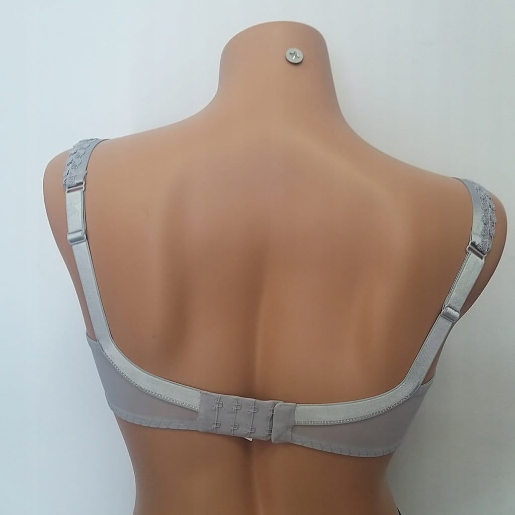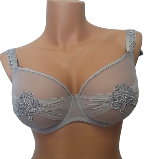 Wyjątkowa miękka propozycja w kolorze szarym-gołębim. Miseczki wykonane z przezroczystego tiulu, ozdobione gipiurą w kształcie kwiatu. Lekki niczym mgiełka biustonosz wygląda niezwykle uwodzicielsko i zmysłowo. Konstrukcja miseczki jest trójdzielna, ma jedno cięcie pionowe i poziome. Kształt biustu jest zebrany do środka i uniesiony. Ramiączka ozdobione są do połowy koronkową gipiurą, są regulowane do połowy. Biustonosz posiada gładki, zapinany na dwie haftki tył.