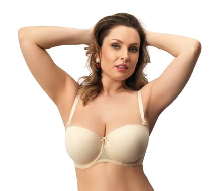 Biustonosz w kolorze cielistym jest całkowicie gładki i niewidoczny pod ubraniem, co sprawia, że możesz nosić go z każdym strojem. Dodatkowo, ramiączka można dowolnie przepinać dzięki specjalnej taśmie z zaczepami na całej długości miseczek.