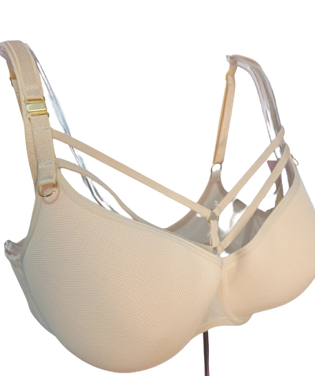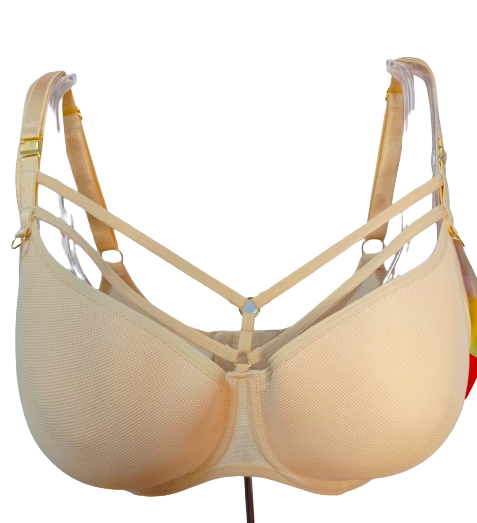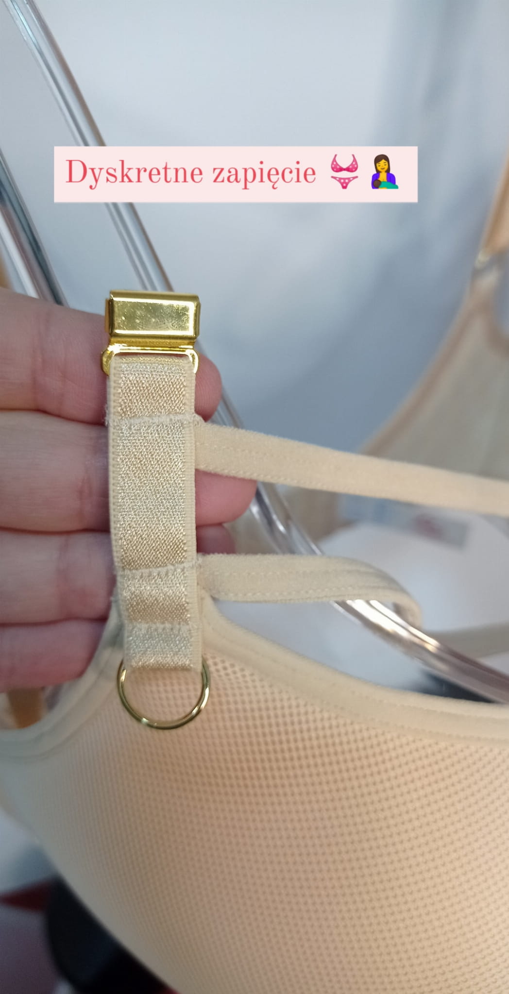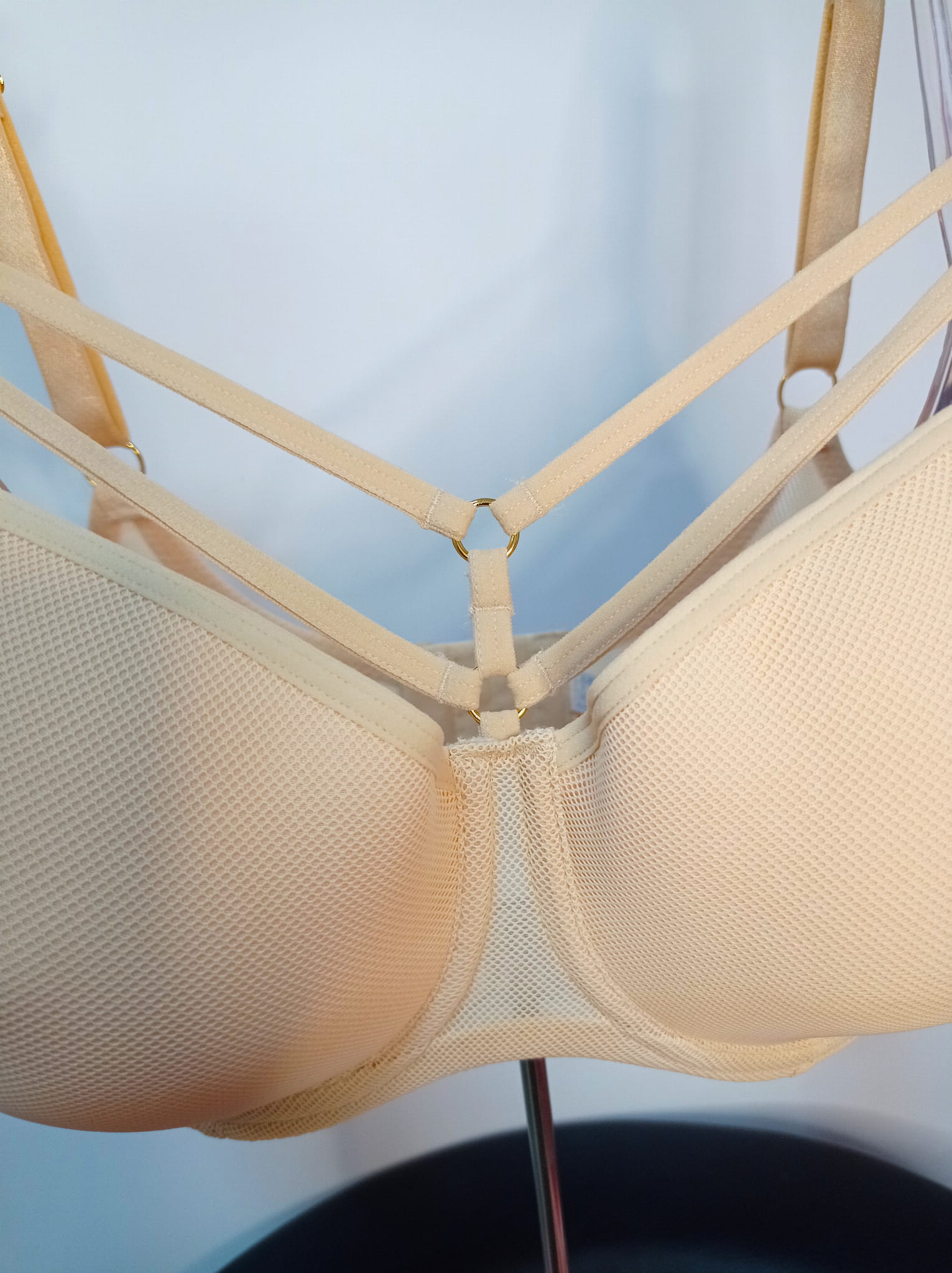 Beżowe miseczki ozdobione są beżowym, subtelnym tiulem, dzięki czemu biustonosz jest niewidoczny pod jasnymi ubraniami. Dekolt zdobią zmysłowe paseczki przymocowane złotymi, biżuteryjnymi kółeczkami. Ramiączka są regulowane do 2/3 swojej długości. Zapięcie trzystopniowe na dwie lub trzy haftki.