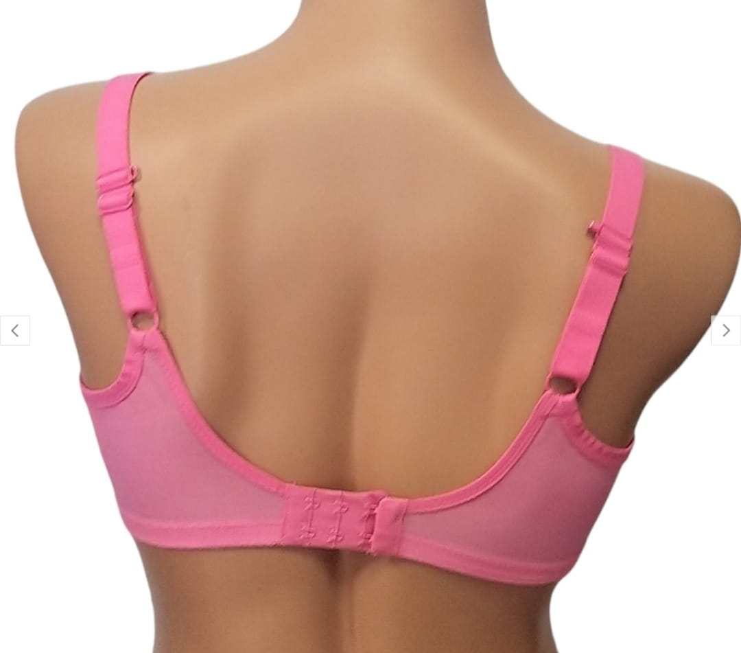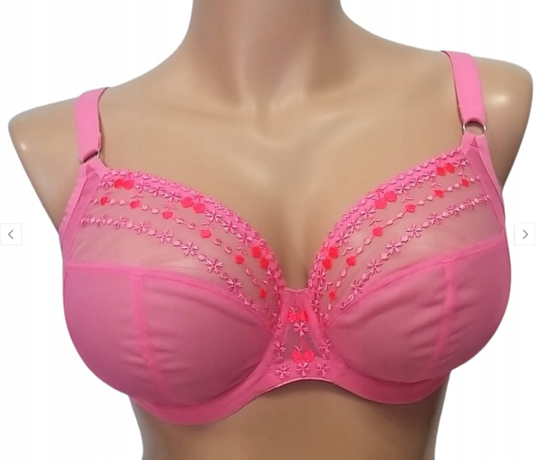 Biustonosz Elomi Matilda miękki różany - jest biustonoszem z fiszbinami przeznaczonymi do głębszych dekoltów. Miseczki z półprzejrzystej siateczki, w górnej części ozdobione haftem z motywem wisienek w ciemniejszym kolorze. Specjalny krój miseczki zapewnia zebranie piersi z boków, dzięki czemu dodatkowo nas to wysmukli. Dolna część miseczki wzmocniona jest dodatkową warstwą materiału, natomiast tył zrobiony jest z mocnego materiału (powermesh).