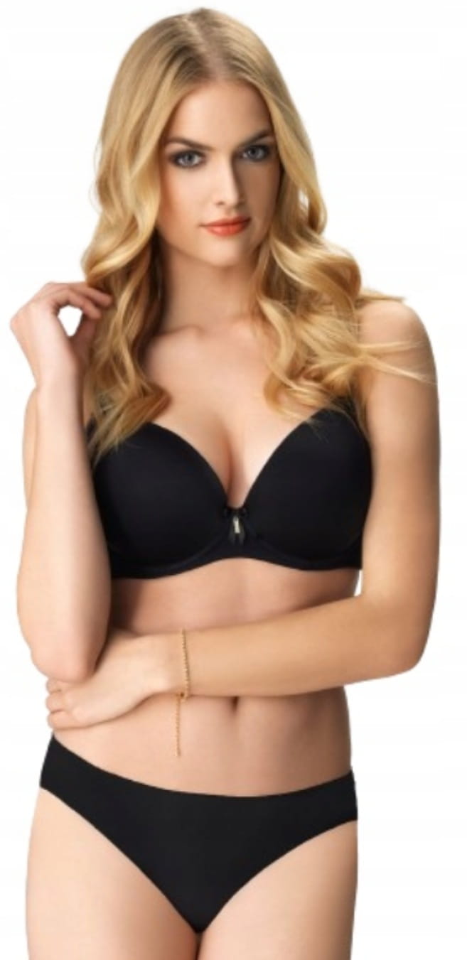 • Konstrukcja: Miseczki tego biustonosza są stworzone z miękkiej, cienkiej pianki, co pozwala na idealne ukształtowanie i zaokrąglenie biustu. Dzięki nisko umiejscowionemu mostkowi, biust jest efektownie prezentowany, gdyż piersi są delikatnie przyciągane do środka, a zastosowany efekt push up, podnosi je. Biust w tym modelu jest pięknie zaokrąglony i wyeksponowany.