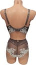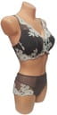 Biustonosz został wykonany z oddychającej tkaniny, która pozwala skórze swobodnie oddychać, co zapobiega poceniu się piersi. Szare miseczki są pokryte delikatną koronką z motywem kwiatowym, która subtelnie przechodzi w górę, tworząc efektowny i niezwykle zmysłowy wygląd.